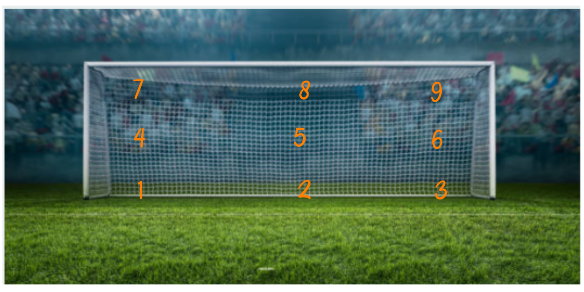 Figura 2.1 Zonas de un arco de futbol Si observamos el cobro de un “penalti” en un partido de fútbol, el cobrador tiene un gran número de posibilidades (lugares) para colocar el balón que podemos simplificar en 9 como se muestra en la Figura 2.1 : (1) parte baja a su izquierda, (2) baja al centro, (3) baja a su derecha, (4) parte media a su izquierda, (5) media al medio, (6) parte centro a la derecha y finalmente (7) parte superior a su izquierda, (8) parte superior al centro y (9) parte superior a su derecha . Por su parte el arquero piensa también es estos lugrares para evitar que el disparo termine en gol. Ambos jugadores estudian las frecuencias para determinar cual lugar ofrece mayores probabilidades de obtener éxito desde su rol.
