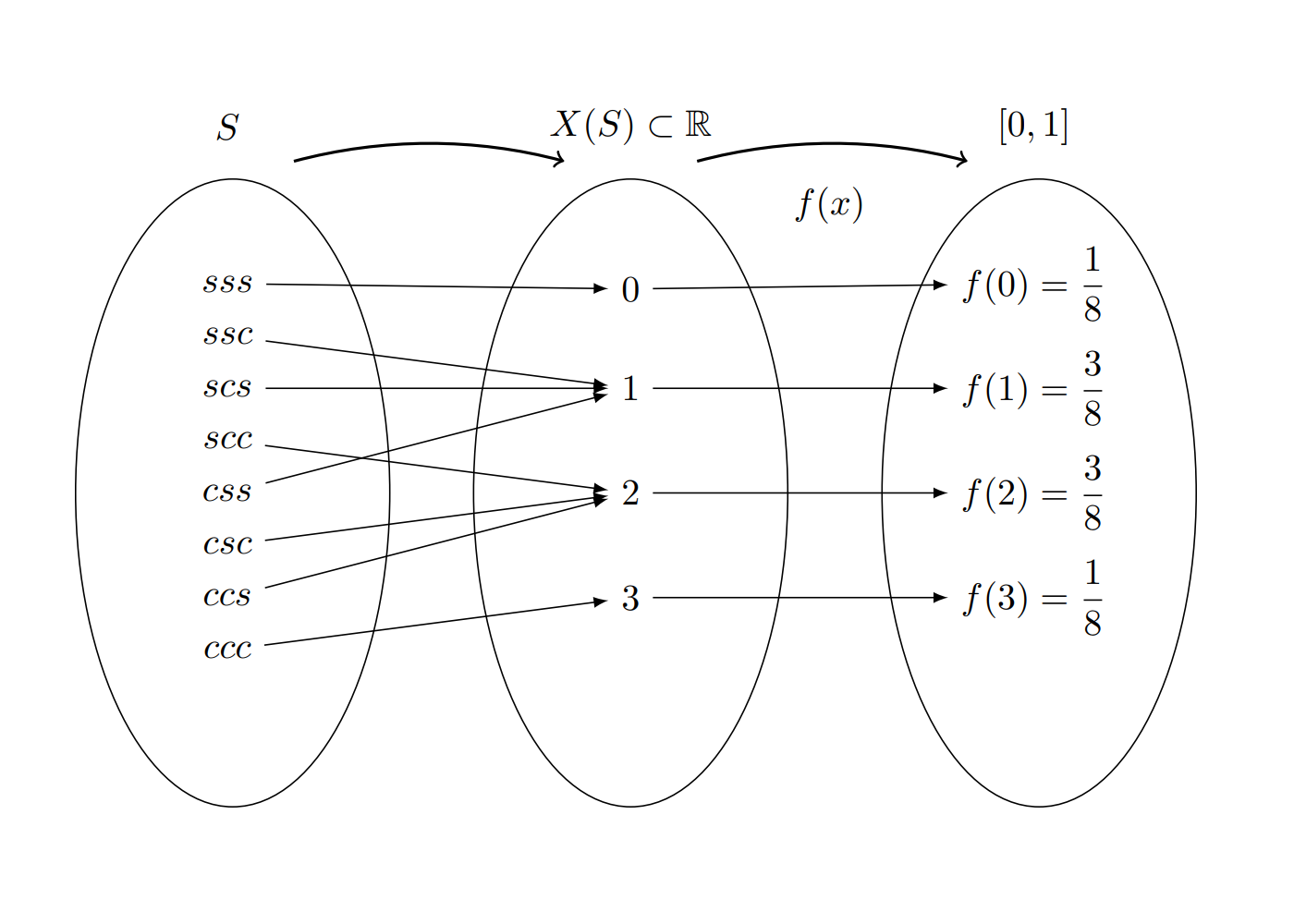 \[f_{_{X}}(0) =P(X=0)= \frac{1}{8} \hspace{.2cm} ,\hspace{.5cm} f_{_{X}}(1) = P(X=1)=\frac{3}{8},\] \[f_{_{X}}(2) = P(X=2)=\frac{3}{8}\hspace{.2cm} ,\hspace{.5cm} f_{_{X}}(3) =P(X=3)= \frac{1}{8}\]