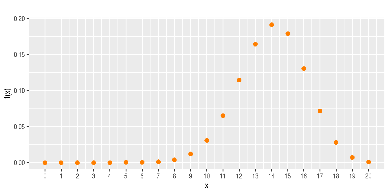 \[f_{_{X}}(x) = \left \{ \begin{matrix} \displaystyle\binom{20}{x}(0.7)^{x}(0.3)^{20-x} & \mbox{si } x=0,1,2,\ldots,20\\ & \\ 0 & \mbox{en otro caso } \end{matrix}\right.\]
