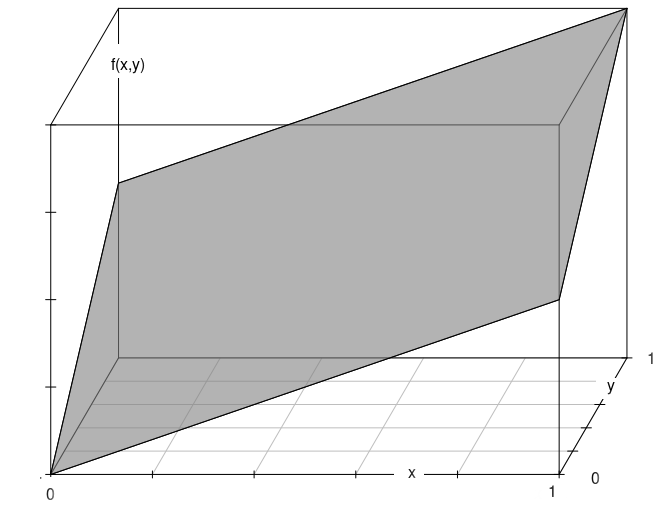 Figura 2.17 Distribución conjunta \(f(x,y)= x+y\) para \(0 \leq x \leq 1\) y \(0 \leq y \leq 1\)