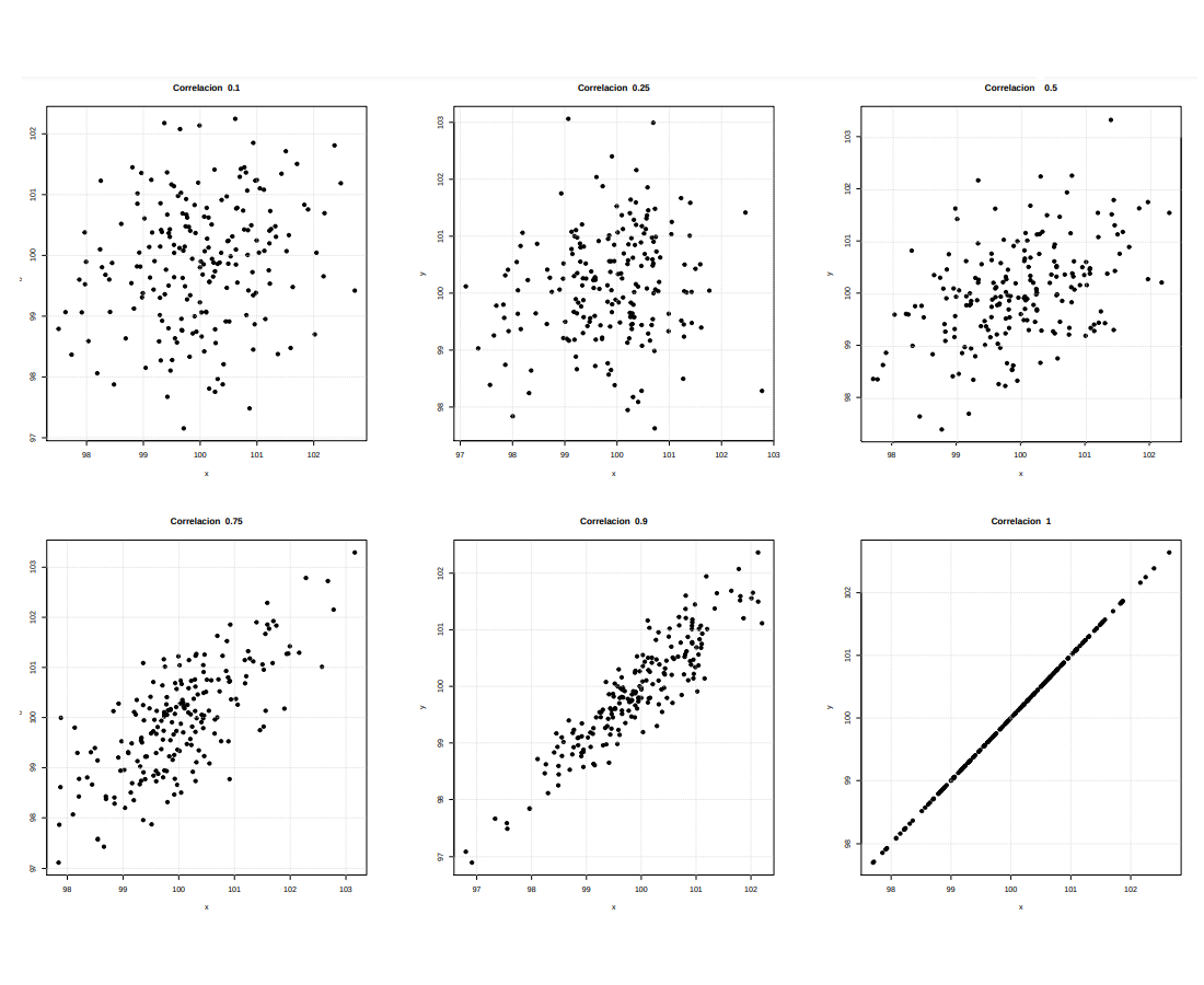 Figura 2. 17 Correlaciones positivas (a) \(\rho = 0.10\).\(\hspace{.5cm}\) (b) \(\rho = 0.25\). Sean \(X\) y \(Y\) dos variables aleatorias discretas o continuas con función de probabilidad conjunta \(f(x,y)\) y funciones de probabilidad marginales \(g(x)\) y \(h(y)\), respectivas, entonces se dice que las variables X y Y son estadísticamente independientes si:
