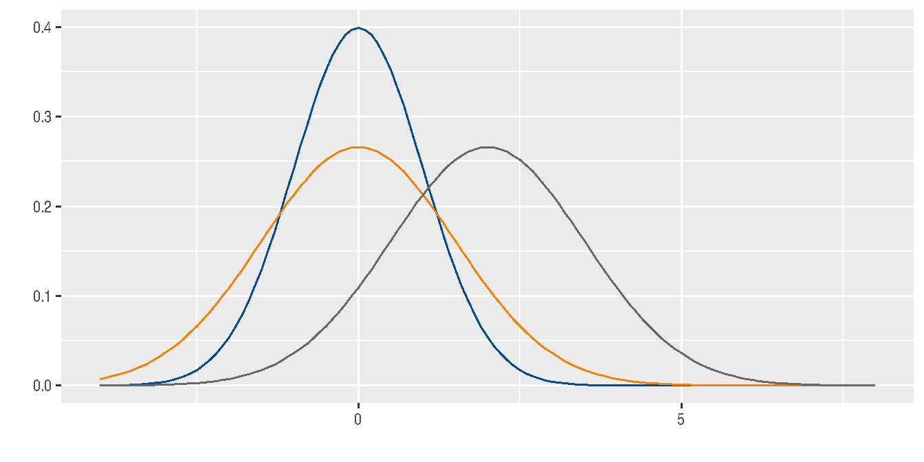 Figura 2.24 Función de densidad normal : \(X \sim N(0,1)\), \(X \sim N(0,1.5)\) y \(X \sim N(2,1.5)\)