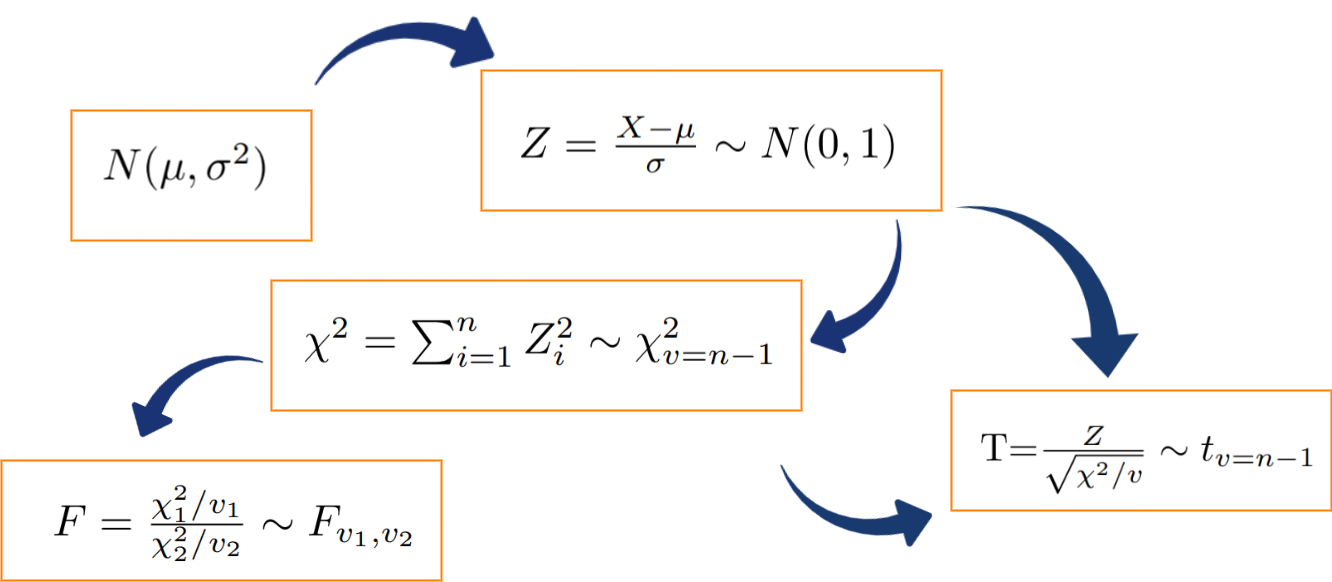 Si una variable X se distribuye normal con parámetros \(\mu\) y \(\sigma^{2}\), entonces a partir de su transformación se puede obtener una variable Z que tenga distribución normal estándar \(N(0,1)\), que tiene media cero y varianza uno. Varias normales estándar al cuadrado conforman una variable con distribución chi-cuadrado y a su vez esta variable tiene la propiedad tal que la suma de \(n\) variables aleatorias \(\chi^{2}\) con \(n-1\) grados de libertad. La razón de una variable con distribución normal estándar y la raíz cuadrada de una variable chi-cuadrado, dividida por sus grados de libertad originan una variable con distribución t-student. Por último la razón de dos variables con distribución chi-cuadrado, divididas cada una por sus respectivos grados de libertad, generan una variable con distribución F-Fisher.