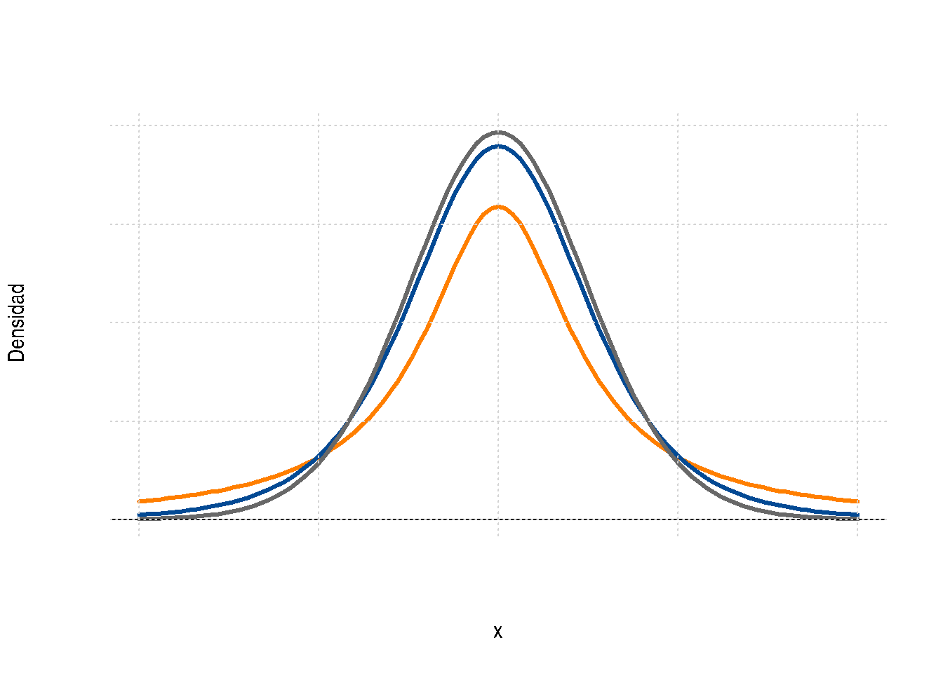 La gráfica de la distribución t-student es similar a la de la distribución normal, salvo que sus colas son más pesadas.