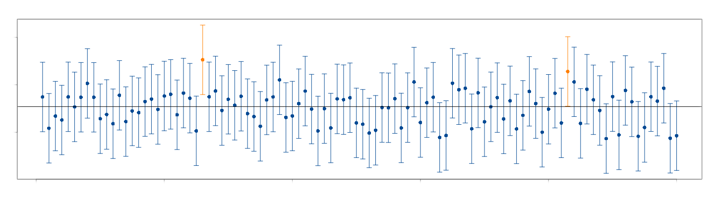 Al contarlos se encuentra que 2 no lo contienen (de color naranja), mientras que 98 lo contiene, por tanto este procedimiento tiene una confianza del 98% de contener el valor de \(\mu\).
